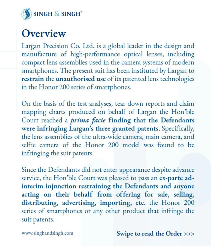 Singh & Singh律所表示,由于被告在已获提前送达通知的情况下仍未出庭,法院于是作出单方临时禁令,禁止被告及其任何代理人从事荣耀200系列智能手机或任何其他侵犯本案专利的产品的要约销售、销售、分销、广告宣传、进口等行为。